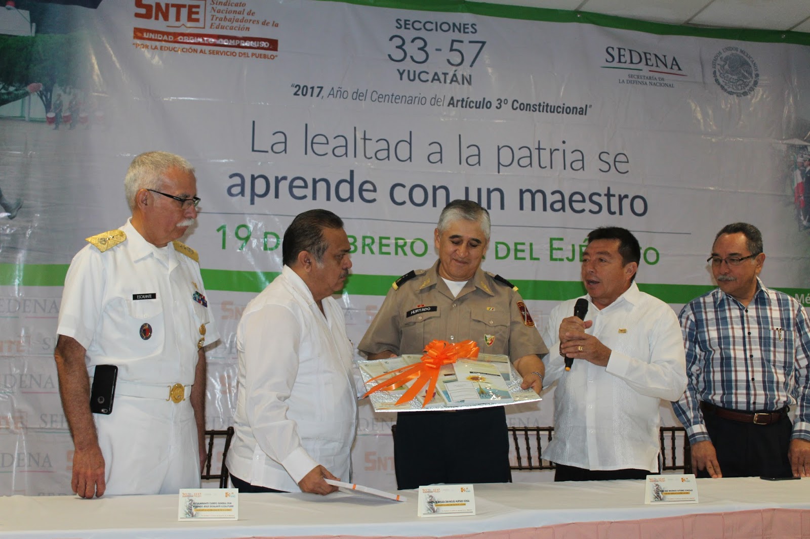 En la ceremonia estuvieron presentes los secretarios de las Secciones 33 y 57 del SNTE, Prof. Jose Crescencio Gutiérrez González y Luis María Aguilar Castillo, respectivamente. El General de Brigada Diplomado de Estado Mayor Miguel Hurtado Ochoa, Comandante de la XXXII Zona Militar, el Abogado Rolando Bello Paredes Director Jurídico de la Secretaria de Educación del Estado de Yucatán, el Mayor Ingeniero Constructor Diplomado de Estado Mayor Juan Manuel Sánchez García, integrante del Séptimo Batallón de Ingenieros de Combate de la SEDENA; el Vicealmirante Cuerpo General Diplomado de Estado Mayor Rosendo Jesús Escalante Ilizaliturri Comandante de la Novena Zona Militar de la SEDENA; el Coronel Fuerza Aérea Aviador José Luis Alesio Gálvez integrante de la Base Militar Número Ocho de la Fuerza Aérea Militar; el Comisario Julio César Martínez Coordinador Estatal de la Policía Federal en el Estado de Yucatán; así como los integrantes de ambas secciones sindicales.