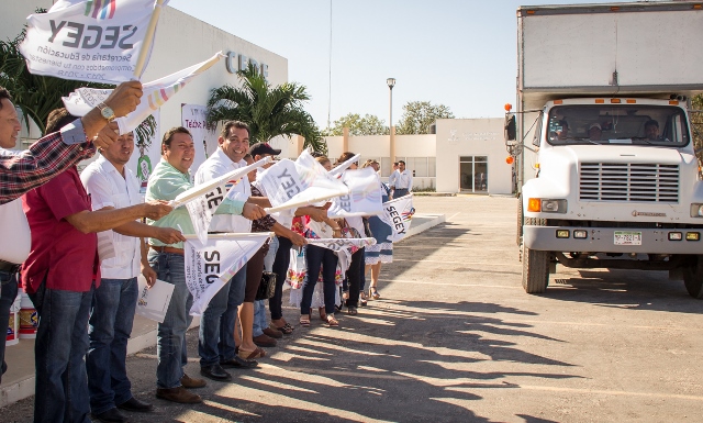 En el marco de la firma de este convenio, se entregó 576 botes de pintura para atender a 48 planteles de la región, así como mobiliario para Escuelas de Tiempo Completo.
