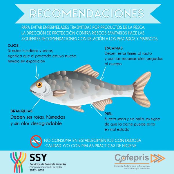 Para evitar contagios o enfermedades, la Dirección de Protección Contra Riesgos Sanitarios recomienda que al adquirir pescados y mariscos se busque productos con buen aspecto y de piel brillante, es decir, debe verse húmedo, firme al tacto y con escamas bien pegadas al cuerpo.