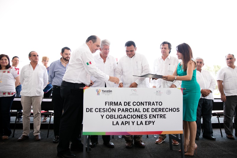 El Gobernador Rolando Zapata Bello y el titular de la Secretaría de Comunicaciones y Transportes (SCT), Gerardo Ruiz Esparza, en una nueva gira por la entidad, atestiguaron la firma del Contrato de Cesión Parcial de Derechos y Obligaciones entre la Administración Portuaria Integral (API) y la Empresa Portuaria Yucateca (EPY), así como la entrega de obras de infraestructura marítima y terrestre por más de mil millones de pesos.