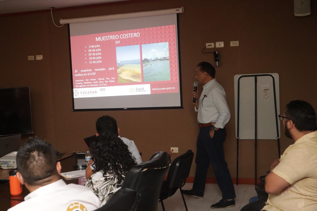 Durante la Segunda Reunión Extraordinaria del Comité Interinstitucional, se presentaron los resultados de los muestreos realizados en diversos puntos del litoral yucateco por parte del Laboratorio Estatal de Salud Pública.