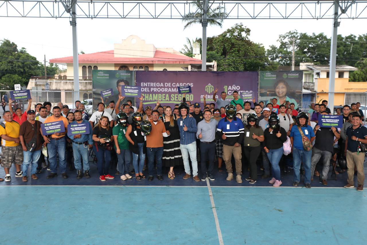 Para seguir cuidando de las y los meridanos que utilizan la motocicleta como medio para llevar sustento a sus hogares, la presidenta municipal Cecilia Patrón Laviada realizó la quinta entrega del programa Chambea Seguro que incluyó 130 cascos gratuitos certificados con la norma DOT.