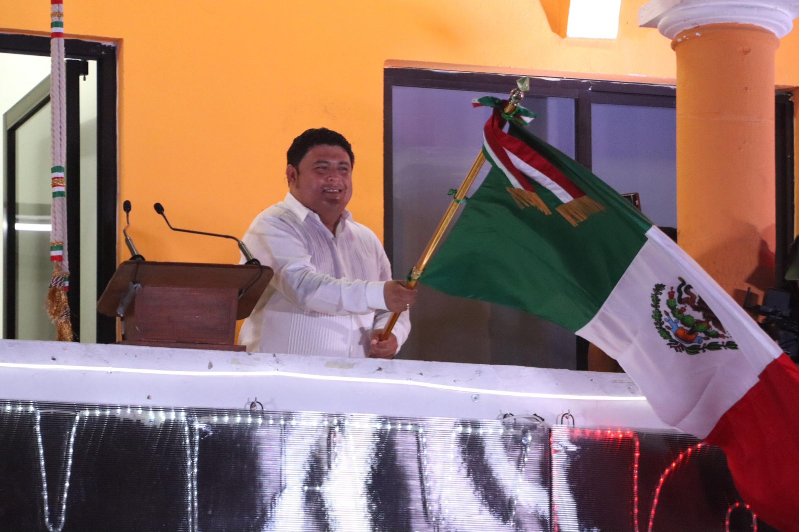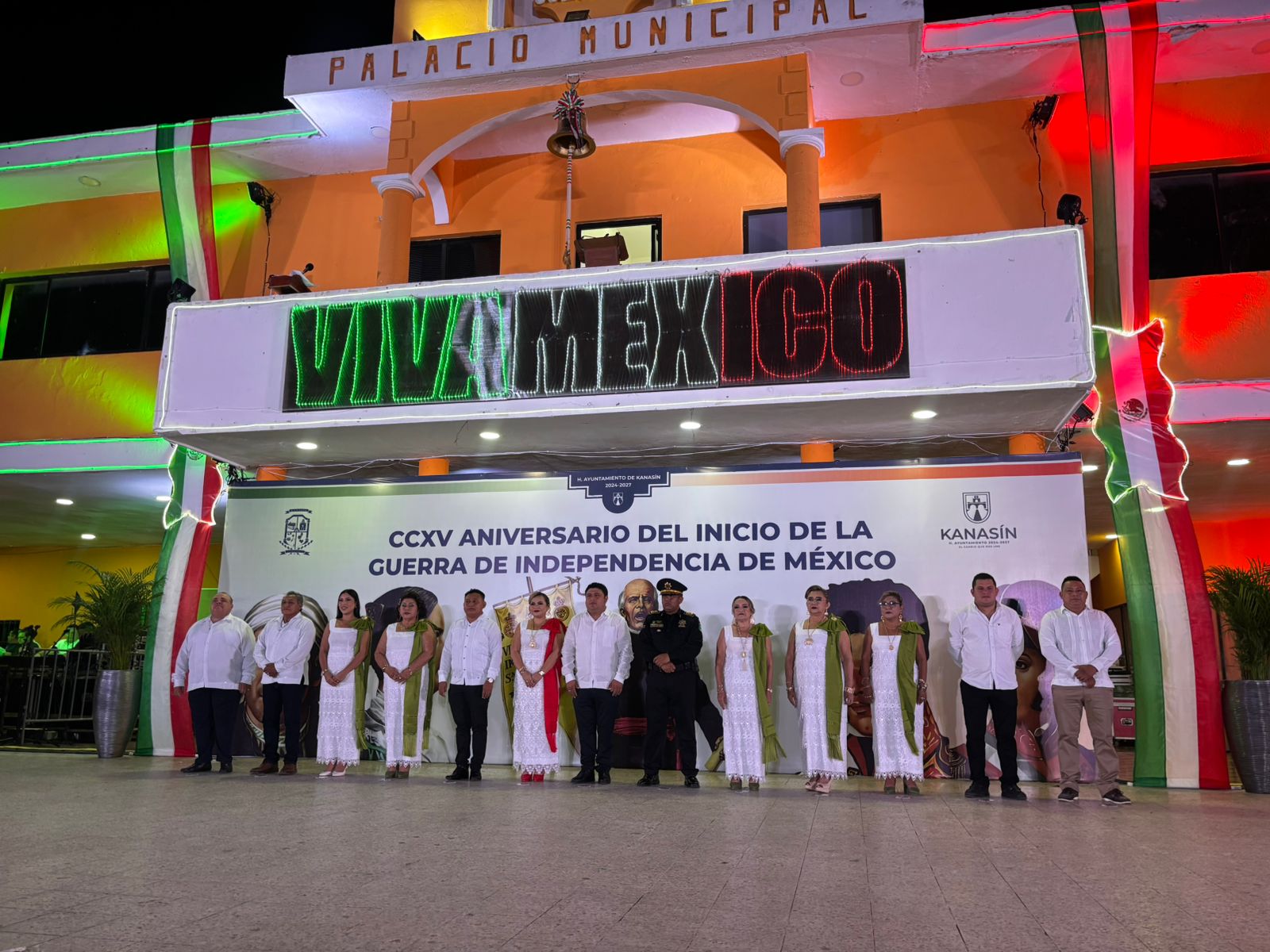 Desde el balcón principal, el alcalde de Kanasín estuvo acompañado de su esposa Raquel Balam Rocha de Bojórquez y de sus hijos Edwin, Ricardo y Jimena, y desde ahí lanzó vivas a México, a los héroes que dieron independencia, a la democracia, a la inclusión social en Kanasín, a las mujeres y deportistas del municipio, a que haya llegado el cambio a Kanasín y a Yucatán.