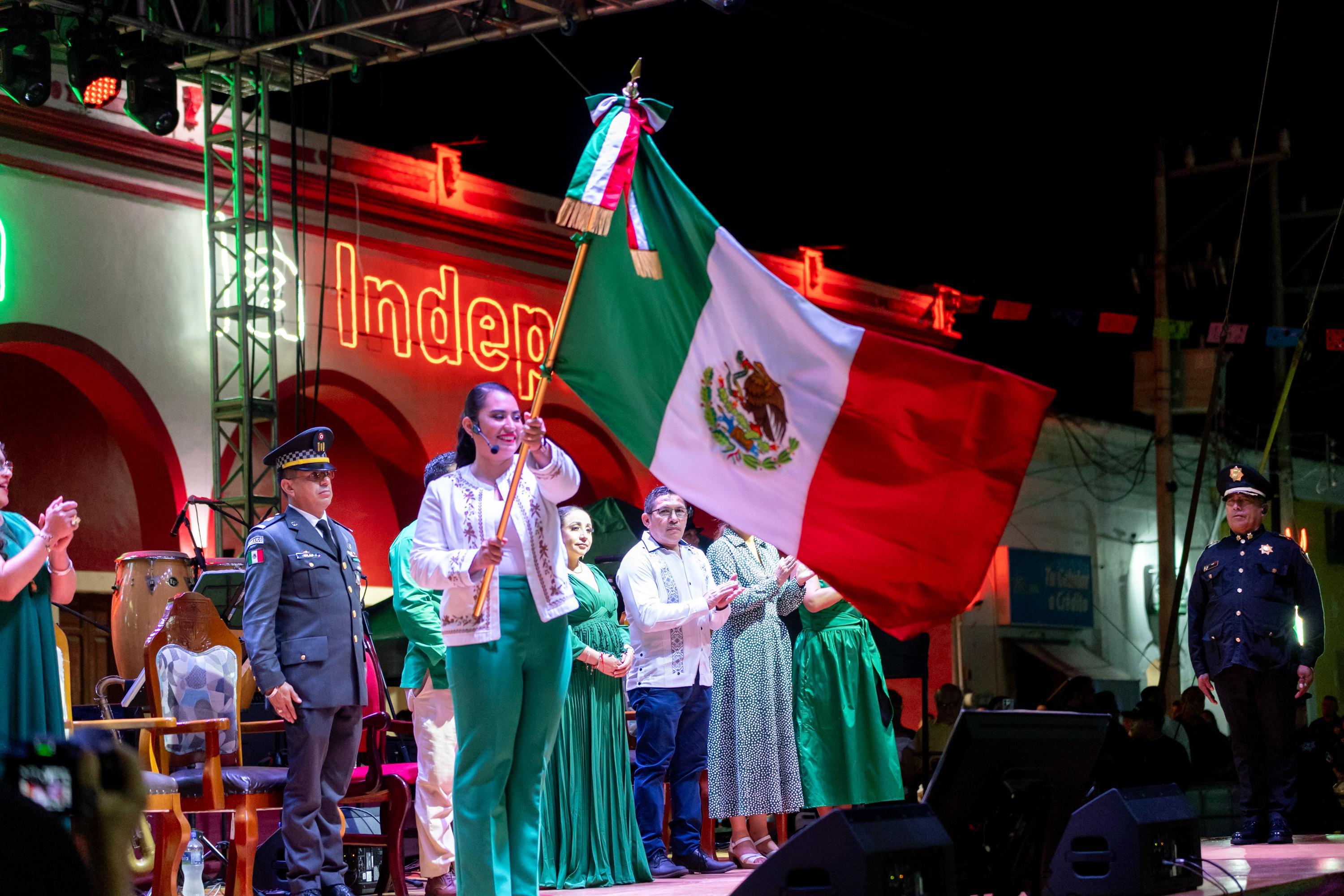 Desde los bajos del Palacio Municipal, la alcaldesa Kenia Walldina Sauri Maradiaga encabezó la ceremonia del Grito de Independencia, acompañada por el Capitán Segundo de la Guardia Nacional, Elías Hernández Islas, integrantes del cabildo y sus familiares.