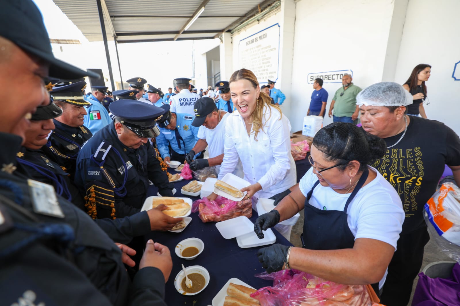 Al concluir el desfile conmemorativo, Cecilia Patrón visitó las instalaciones de la Policía Municipal de Mérida para felicitar a los elementos policiales por su destacada participación durante el desarrollo de estas actividades.