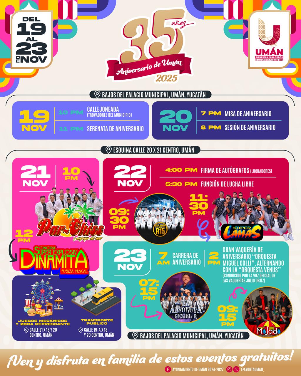 Con este programa, Umán celebra 35 años de historia y crecimiento, consolidándose como una ciudad viva, alegre y orgullosa de su gente, donde el bienestar para todas y todos sigue siendo la mayor motivación.