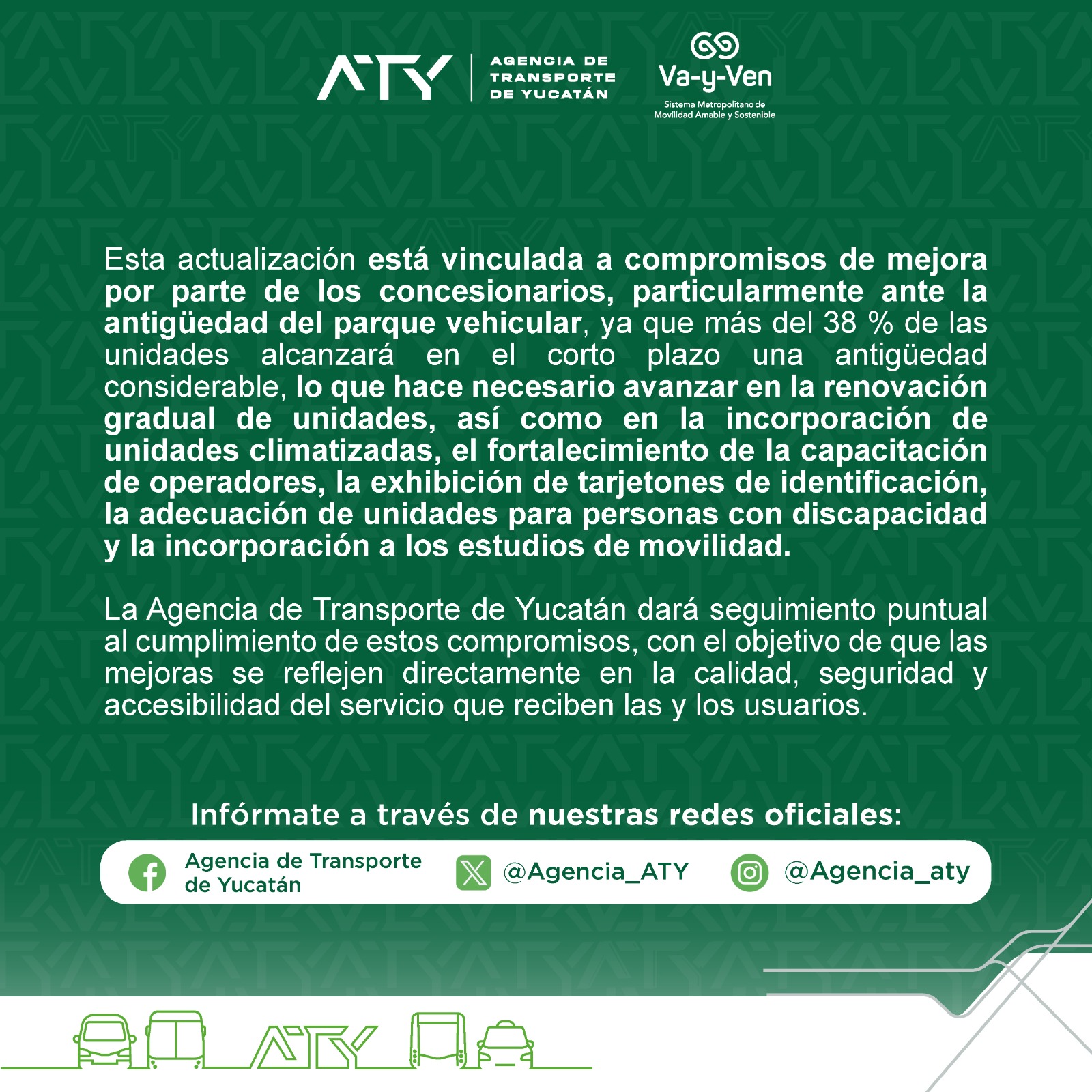 La ATY mantendrá supervisión permanente sobre el cumplimiento de estos compromisos, con el propósito de que la actualización tarifaria se traduzca en mejoras reales en calidad, seguridad y accesibilidad del servicio de transporte colectivo en beneficio de las y los usuarios.