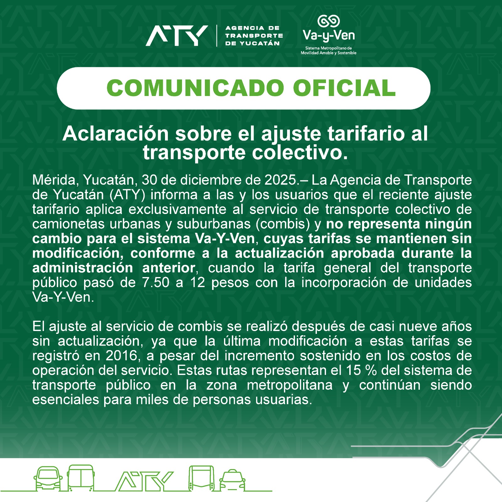 La Agencia de Transporte de Yucatán (ATY) precisa que el ajuste tarifario recientemente anunciado aplica únicamente al servicio de transporte colectivo operado mediante camionetas urbanas y suburbanas (combis), sin que exista modificación alguna en las tarifas del sistema Va y Ven, las cuales permanecen vigentes conforme a la actualización aprobada en la administración anterior, cuando la tarifa general del transporte público se estableció en 12 pesos con la incorporación de dicho sistema.