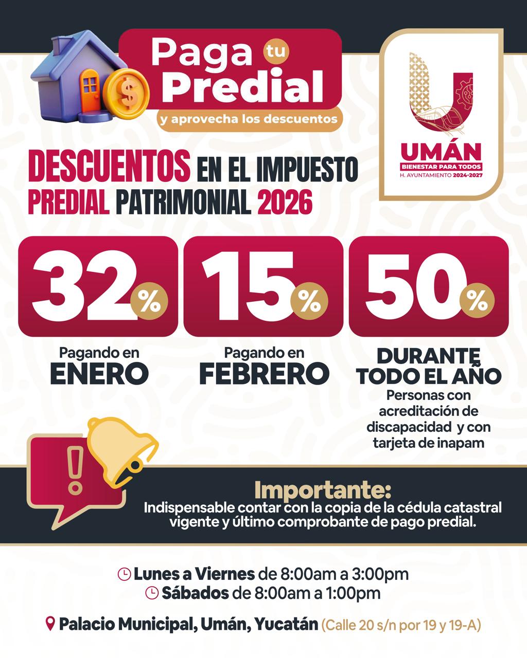 Luego de su aprobación en Cabildo, el Ayuntamiento autorizó por segunda ocasión los mayores descuentos en el pago del impuesto predial en Yucatán, con un 32% en enero, 15% en febrero y 50% durante todo el año para personas con discapacidad y personas adultas mayores con acreditación e INAPAM.