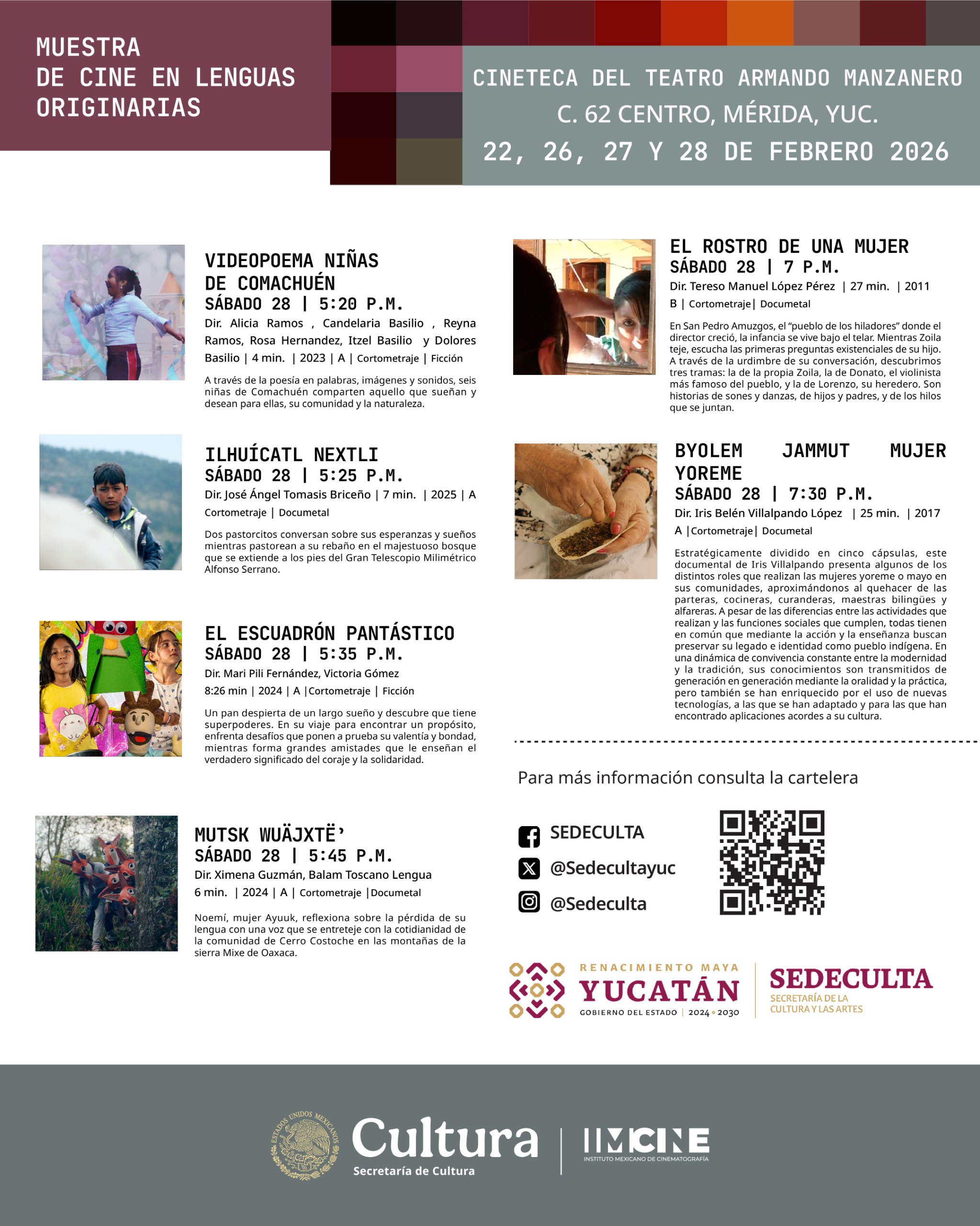 La Secretaría de la Cultura y las Artes de Yucatán (Sedeculta), en colaboración con el Instituto Mexicano de Cinematografía (Imcine), presenta en la Cineteca del Teatro Armando Manzanero la Muestra de Cine en Lenguas Originarias, con proyecciones de entrada libre.